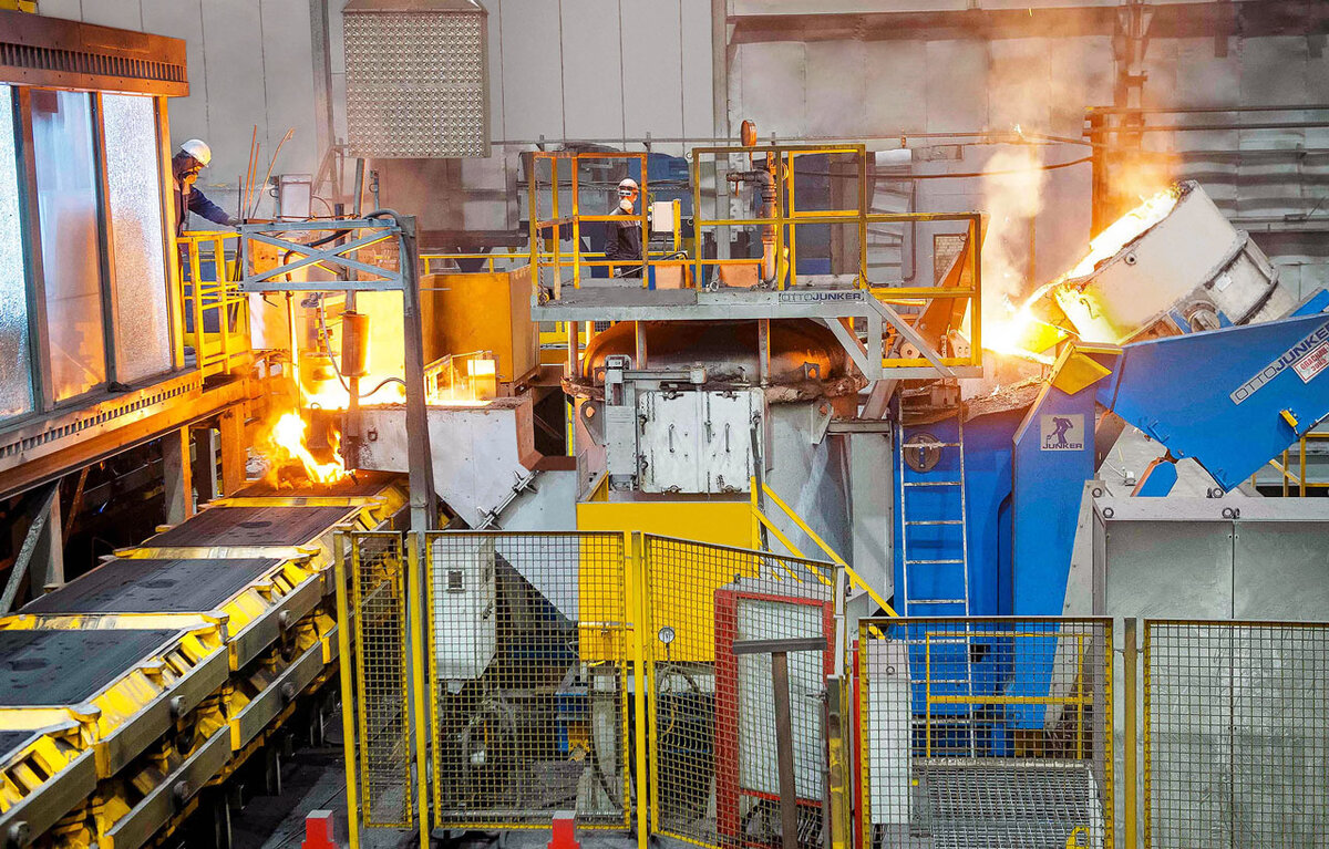 На старом литейном производстве ГАЗа при работе с чугуном преимущественно использовали непрерывную ваграночную плавку. Вагранка – плавильная печь, где топливом служит уголь или природный газ. На новом производстве применяют электрические индукционные печи. Они экономичны и экологичны, с ними легче добиться стабильности состава чугуна, обеспечить строгое соответствие требуемым характеристикам. Индукционную плавку можно остановить, скорректировать состав чугуна, добавить легирующие компоненты. Кроме того, здесь нет разливочного ковша. Расплавленный чугун идет в заливочное устройство, разливка по формам автоматическая, с компьютерным управлением. Литье идет «в землю». Но на самом деле это не земля, а специальная формовочная смесь, состав которой задает компьютер.