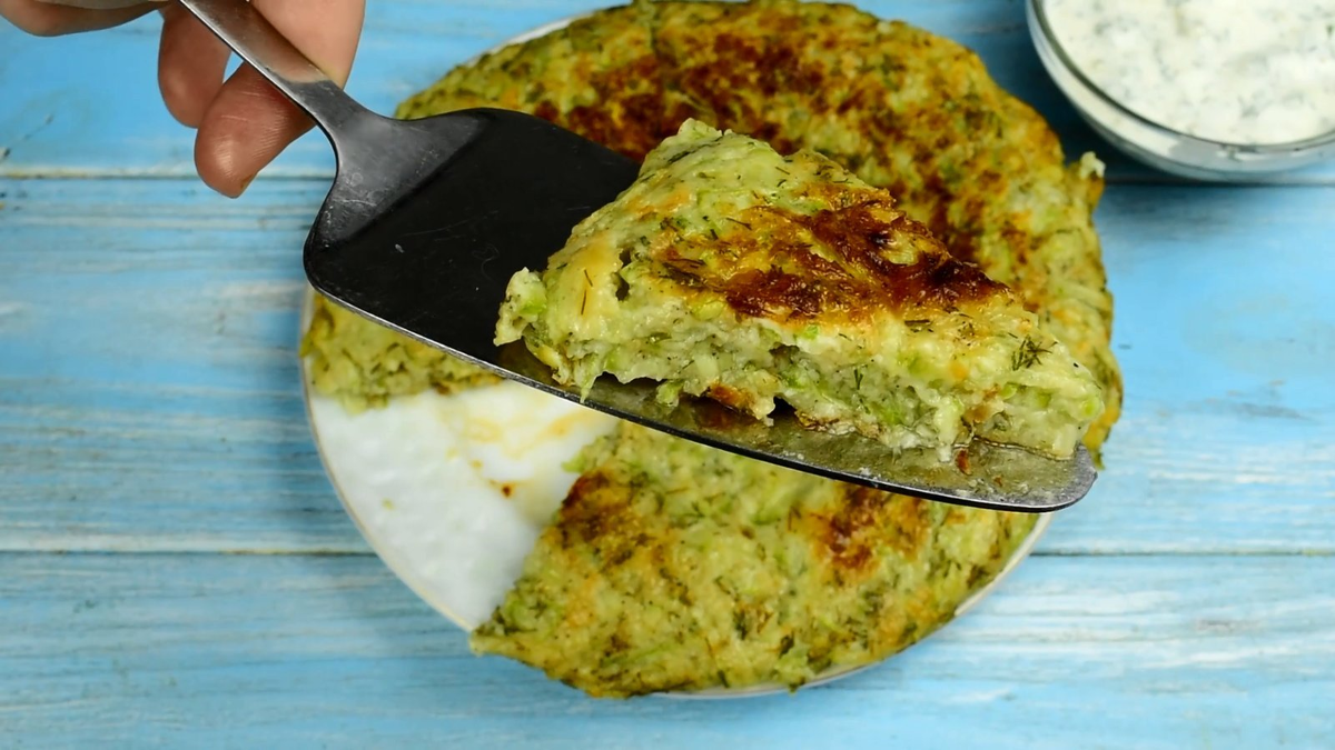 Без возни, готовим настолько просто, что с этим справится даже подросток. Шаг 1: молодой кабачок промыть, натереть на крупной тёрке. Если у вас уже большой кабачок, с толстой шкуркой, рекомендую его очистить от кожуры и семян. Шаг 2: добавить одно яйцо. Шаг 3: добавить 1/2 ч. ложку соли, черного перца и 1 тёртый зубчик чеснока. Шаг 4: добавить немного измельченного укропа и все хорошо перемешать. Шаг 5: просеять 2 ст. ложки муки, перемешать Шаг 6: разогреваем большую сковороду, добавляем растительное масло (примерно 30 мл.), выкладываем всю кабачковую смесь и распределяем по сковороде. Жарим под крышкой на медленном огне 10 минут. Шаг 7: переворачиваем большой кабачковый блин и жарим под крышкой еще 5-7 минут. Для того чтобы перевернуть блин - для начала сверху положите большую тарелку, переверните сковороду с тарелкой и блин с тарелки опустите обратно на сковороду, так кабачковый блин не порвется. Шаг 8: готовим соус - 2 ст. ложки сметаны, щепотка соли, немного измельченного укропа,