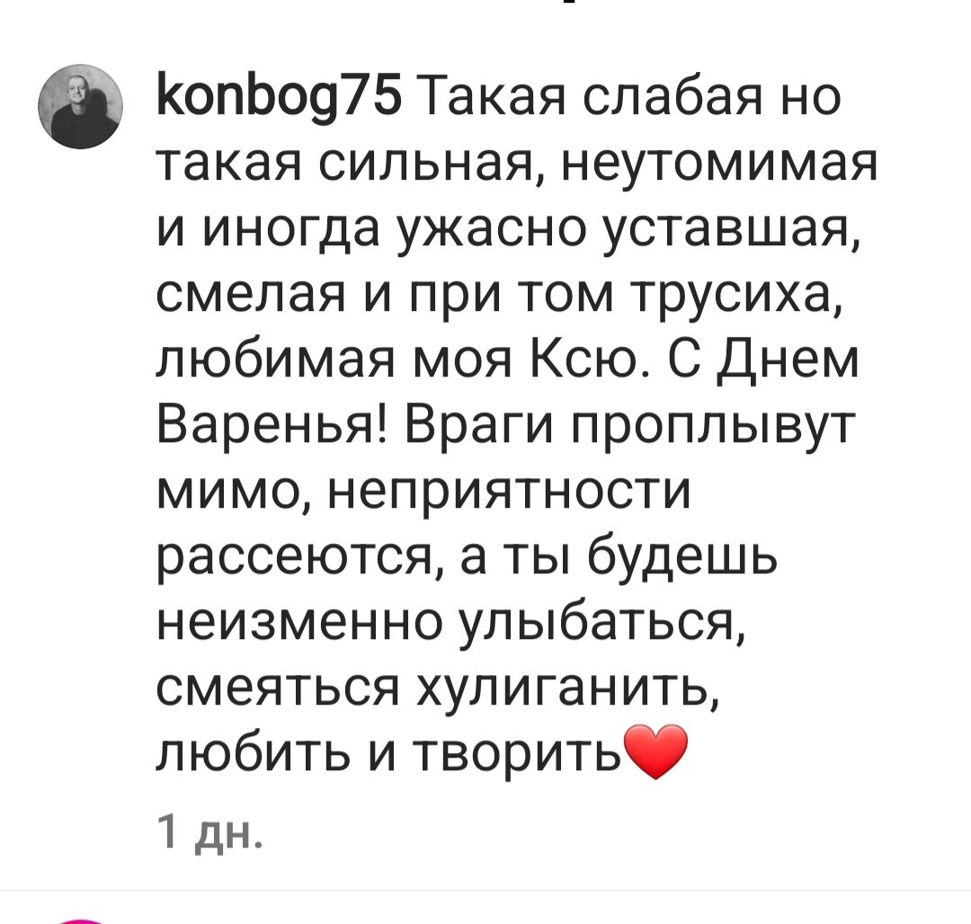 А я откушала тёмного нефильтрованного и сижу .... сочувствую. Вы знаете, мне, почему-то, всегда жальче тех, кто сильный пол, он же крепкая стена, он же жилетка, он же плечо. Именно сейчас, в эту трудную годину и не хватает Ксении того плеча, на котором жилетка мужа. Эта стена осталась дома, а леди Ксю приходится прикладываться к чужому сооружению и там сокрушаться и переоценивать ценности. Стена плача, держись. 🤦♀️🤦♀️🤦♀️ Муж Ксюши, вон, держится! Эдакий оголтелый оптимист. Он так своеобразно поздравил любимую с 41-летием, зачитаешься: Я конечно, не против улыбок и смеха, но на счёт хулиганства это он не подумал. Все её эти фулюганства в инете записаны. Так там она молодая, сочная со стройными ногам . Любо-дорого глянуть. А сейчас она дама бальзаковского возраста. Пусть сидит тихо и скромно соответствует. 👀👀👀 А это комментарий под поздравлением: - Эх, Ксю, конечно, дала маху)) Нужно привыкать к новой родине и её фольклору))) Лучше бы дала Маху)) Теперь остаётся молиться