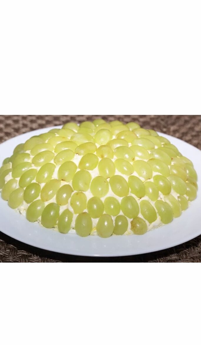 Это салат я сама делала в первый раз. Но изумлению моему не было предела, когда я его попробовала. Первым слоем выкладываем мелко порезанную или пощипанную грудку, смазываем майонезом. Вторым слоем режим мелко красный, салатный лук и тоже промазываем майонезом. Третьим слоем выкладываем грецкий орех порубленный ножом (не очень мелко). Четвёртым слоем трём на крупной тёрке сыр и смазываем майонезом. Пятый слой варёное яйцо трём на тёрке. И последний слой виноград, режем его пополам и раскладываем красиво с верху.