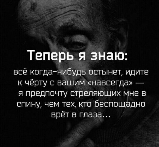 Теперь я знаю: все когда-нибудь остынет Идите к чёрту с вашим «навсегда»! Я предпочту стреляющих мне в спину… Чем тех, кто беспощадно врёт в глаза. Я предпочту сбежать подальше От лживых обещаний и звонков. Хочу жить в мире, где не будет фальши, В том мире, где ещё жива любовь! Теперь я знаю: все когда-нибудь уйдут… Идите к чёрту с вашим «бесконечно»! Теперь я знаю: все когда-нибудь умрут, Ведь жизнь и дружба, всё не вечно. Эль Твит Подпишись