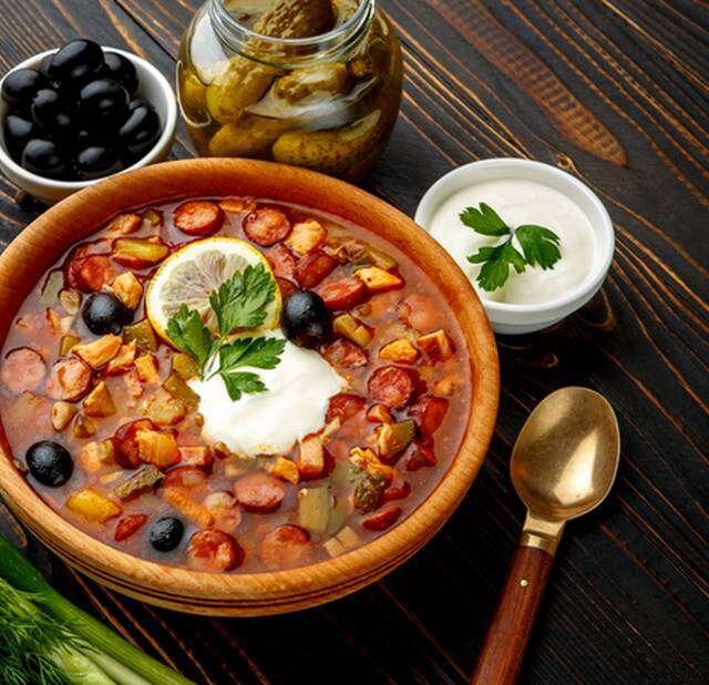 Бульон не следует сильно солить, поскольку все ингредиенты достаточно соленые. Лучше попробовать солянку в самом конце варки и при необходимости досолить.