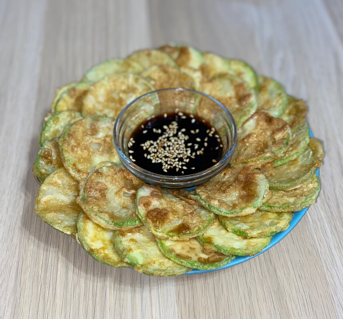 Осталось сервировать наши жареные кабачки. На середину тарелки выставляем соусник, а кабачки выкладываем по кругу от соуса.