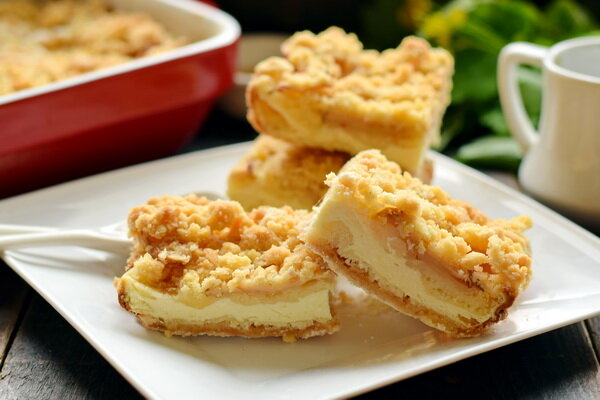 Это так называемый «насыпной пирог», теста в обычном понимании здесь нет. Но не волнуйтесь, готовая выпечка получается нежной и очень вкусной, никакой сухой муки во рту не будет. В качестве начинки – творог и яблоки, вкусный дуэт получается. Но естественно, варианты могут быть любые. Что потребуется: Приготовление: В большой миске соединяем пшеничную муку, сахарный песок и разрыхлитель для теста. Перемешиваем смесь ложкой. Небольшую часть, примерно 3 ст.л., нужно отложить пока в сторону, она понадобится позже. Форму для выпечки смажем кусочком мягкого сливочного масла. Далее выложим половину сахарно-мучной смеси, разравниваем ложкой. Творог взбиваем с куриным яйцом, это можно сделать погружным блендером, миксером и т.п. Выкладываем в форму ровным слоем. Теперь в форму отправляется вторая оставшаяся часть сахарно-мучной смеси. Сверху, как видно на фото, раскладываем кусочками сливочное масло (не всё, около 80 г). Далее слой из яблок. Можно нарезать небольшими ломтиками без кожуры или т