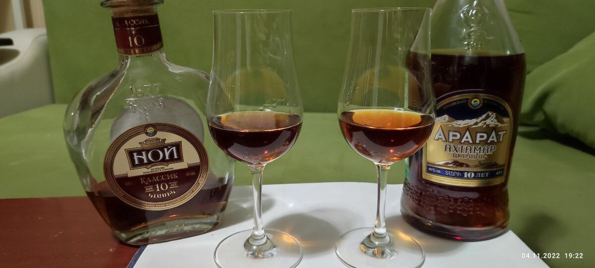 Без предисловия не обойтись. Ной уже с год как является для меня эталоном десятки вообще и маркером для других, даже более выдержанных армян. Как известно, первое впечатление самое сильное, а уж тем паче первая любовь. Ахтамар был вроде бы изначально в проигрышном положении. Тем более он три дня назад по открытию завалился по аромату. Но выпив разом три по 50, я изменил о нём мнение, как о НЕконкуренту Ною. Так что на момент начала баттла считаю их абсолютно равными коньяками. И попытаюсь уточнить раз и навсегда кто "ровней". Для сведения. Ахтамар ещё в старом кузове. Розлив 05.19. Ной-постарше,11.21.