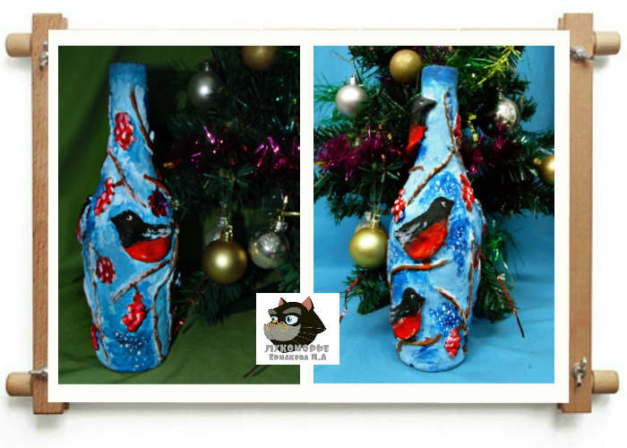 Мастер-класс: декор бутылки лепным украшением своими руками "Снегири"