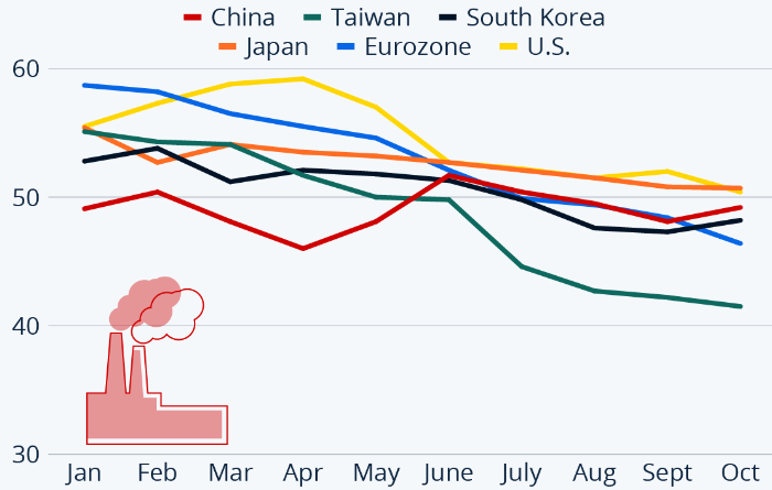Крупнейшие промышленные центры Азии, такие как Тайвань и Южная Корея, столкнулись с одним из самых больших спадов, и это — плохой знак, учитывая их статус индикаторов здоровья глобальной экономики. Динамика индексов деловой активности (PMI) в производственной сфере некоторых стран и регионов мира. Источник: Statista Производственная активность замедляется во всем мире, что свидетельствует об экономическом спаде на фоне инфляции и роста процентных ставок. Крупнейшие промышленные центры Азии, такие как Тайвань и Южная Корея, столкнулись с одним из самых больших спадов, и это — плохой знак, учитывая их статус индикаторов здоровья глобальной экономики. Все индексы деловой активности (PMI), измеренные IHS Markit, Caixin (Китай) и Jibun Bank (Япония), показали отрицательную динамику. Китай, который стал первой страной, где производственная активность снова набрала обороты после первой вспышки Covid-19 в 2020 году, теперь показывает слабые результаты, поскольку Пекин продолжает придерживается