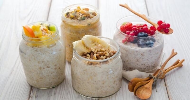 Этот завтрак удобно готовить с ночи, чтобы с утра встать и насладиться потрясающе полезным блюдом. Берем банку объемом 500 мл, смешать в ней молоко, овсянку и йогурт, можно обычный, можно со вкусами. По желанию можно добавить любые фрукты, орехи, сухофрукты, сахар или мед.