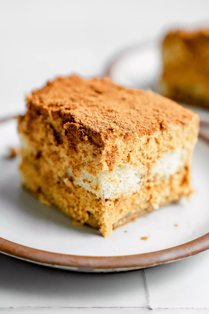 Приготовьте кофе или эспрессо: В неглубокой миске смешайте эспрессо (или кофе) и сахар, помешивая, пока он не растворится. Собираем тирамису: Макайте по одному пальцу в кофейную жидкость, быстро переворачивая его, чтобы смочить обе стороны. Не оставляйте его там более чем на 2 секунды, иначе он станет слишком влажным. По мере того, как вы макаете их, выкладывайте половину божьих пальчиков ровным слоем на дно формы для запекания. Возможно, вам придется разломить часть пополам, чтобы покрыть дно. Подождите, чтобы обмакнуть оставшиеся божьи пальчики, пока не добавите слой тыквенного крема. Сверху добавьте 1/2 тыквенного крема и распределите его ровным слоем. Повторите обмакивание божьих пальчиков и размещен