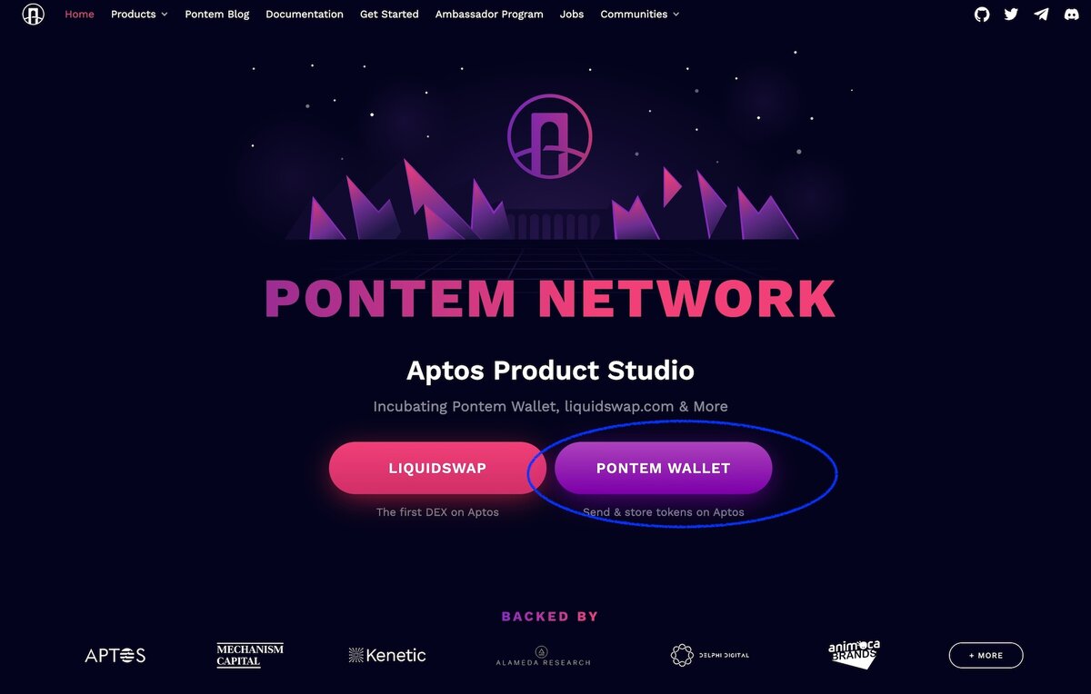 1) Перейдите на сайт https://pontem.network/ и нажмите на кнопку Pontem Wallet.