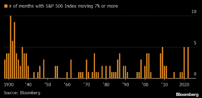 В пяти из десяти месяцев текущего года процентное изменение S&P 500 (как вверх, так и вниз) превышало 7%, что является очень высокой амплитудой колебаний по историческим меркам. По данным Bloomberg, в последний раз S&P 500 показывал столь частое месячное изменение на 7% и больше в 2008 году, а до этого — в период великой Депрессии.