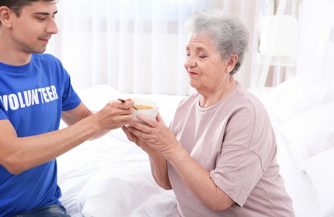 Когда пациент способен к частичному самообслуживанию, надо стараться как можно дольше эти навыки поддерживать, иначе они утрачиваются, и человек становится полностью зависим от постороннего ухода. Поэтому пока руки держат ложку, а голова понимает, что это еда, и её надо есть - мы стараемся сперва организовывать самостоятельный приём пищи, а потом только докармливать. Для маломобильных (не ходит, но может сидеть) - есть прикроватные столики на колесиках, на которые ставятся тарелки. Дома можно использовать такие столики или накроватный поднос (иногда их можно увидеть в соцсетях, когда девушки хвастаются накрытым "завтраком в постель"). Для людей, которые способны передвигаться по дому с ходунками, но не могут переносить тарелки/приборы в руках, существуют подносы на ходунки. Мы в интернате их не используем, поскольку нет надобности - больные либо едят в столовой зоне, либо в палатах, куда пищу привозит буфетчица. Но для дома - отличный лайфхак. Казалось бы, что сложного - накормить че