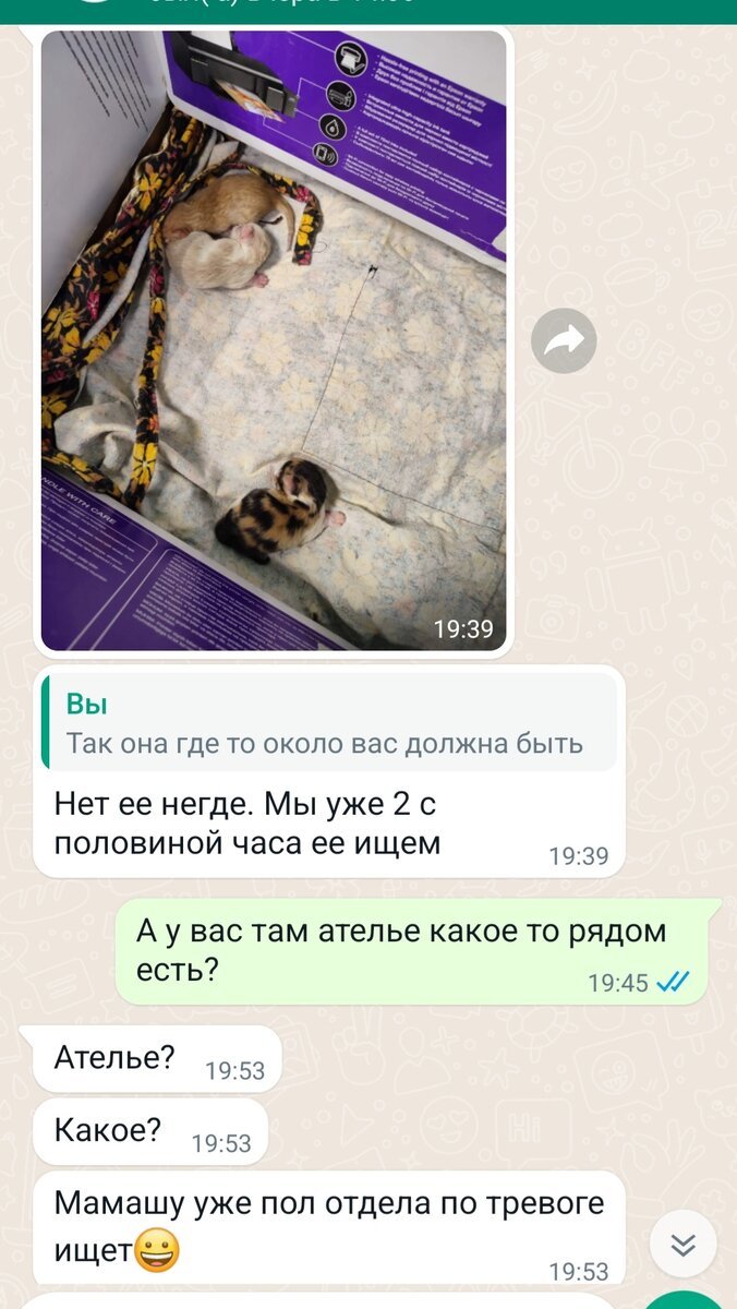 Далее последовал уточняющий вопрос, занимаюсь ли я кошками. Опять не поняв, к чему это, я конечно ответила "нет" и спросила, а что случилось. Мне стали обьяснять, что очень нужна помощь, подкинутым к отделу котятам. Я что то ответила невнятно, типо что то придумаем и на радостях, что я то им и не нужна сбросила трубку. Потом решила все же вникнуть как то в это. Написала в ватсап на звонивший номер, попросила фото котят