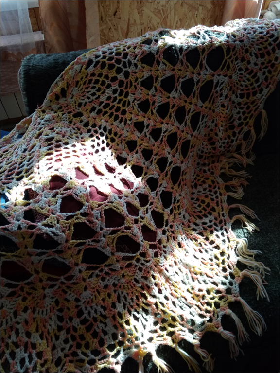 "Солнечная "шаль связана не совсем обычным образом. Она не треугольная. Я бы сказала, что это половина скатерти или салфетки. Для меня действительно необычно и чуждо. Однако результат был ( и есть) потрясающий. Главное достоинство шали, в том, что в неё можно завернуться, и, из-за размера, место ещё будет. Она охватывает всего хозяина, укутывает, убаюкивает... Это теперь я знаю, что акрил даже самый тоненький греет почти так же как шерсть. Но он ещё и не колется! Короче мы втроём решили, что подарок будет отличный.