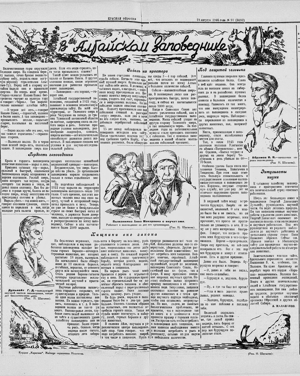 Статья А. Каланакова "В Алтайском заповеднике" опубликована в газете "Красная Ойротия" ("Звезда Алтая" с 1948г.) 18 августа 1946 года. Статья проиллюстрирована авторскими рисунками Н. Шатаева.