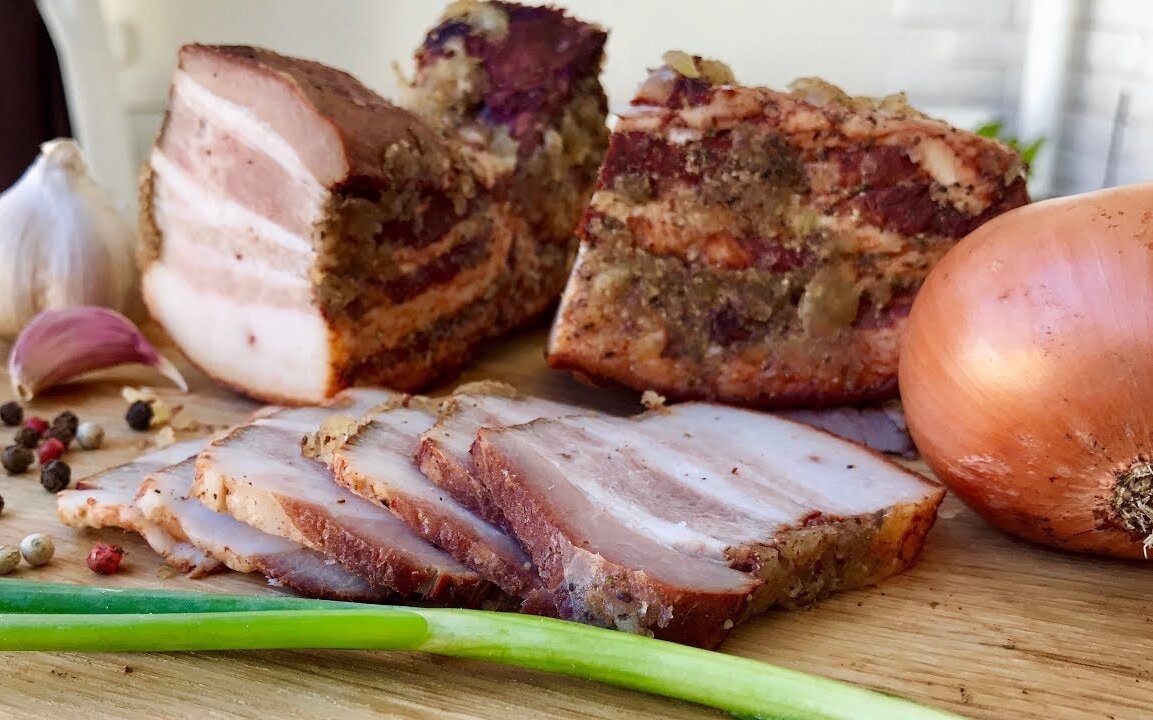 6. Заключительный этап - натираем грудинку чесноком ( через пресс) и чёрным молотым перцем. Убираем в холодильник, и через два часа можно подавать на стол.
