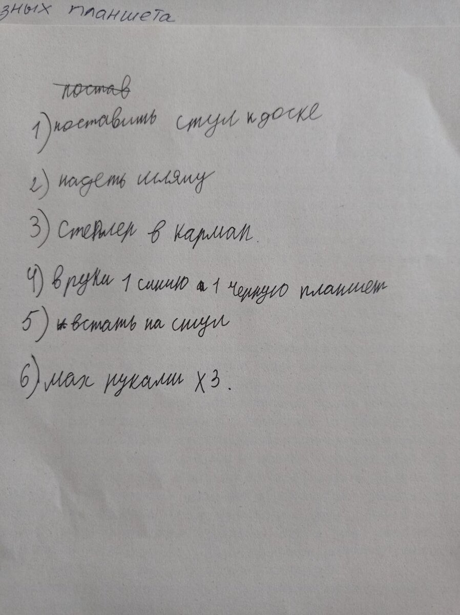 В школе -- математическое погружение. Это значит всю неделю идет большая фоновая игра, а на уроках педагоги предлагают взглянуть на математику сквозь призму своего предмета. На словесности -- раздолье: Цель каждой команды -- написать инструкцию: их товарищ должен выполнить все действия без ошибок. Но в тексте должно быть как можно меньше слов. Среди точных инструкций проиграет самая многословная. Из каждой команды -- выходит человек, чтобы тут же выйти еще раз -- уже за дверь, с заданием. Важно не подслушать, о чем пойдет речь в классе. Командам я показываю, что должно получиться в итоге: прочитав текст, испытатель должен поставить стул на середину, надеть каску, взять из шкафа книги, причем одну из них непременно в зеленой обложке, встать на стул, засунуть книги подмышки -- зеленую -- под правую руку -- и сначала хлопнуть в ладоши три раза, потом изобразить птицу в полете, помахав руками, как крыльями, тоже три раза. Все показываю жестами. (тут, собственно, не важно, что именно показы