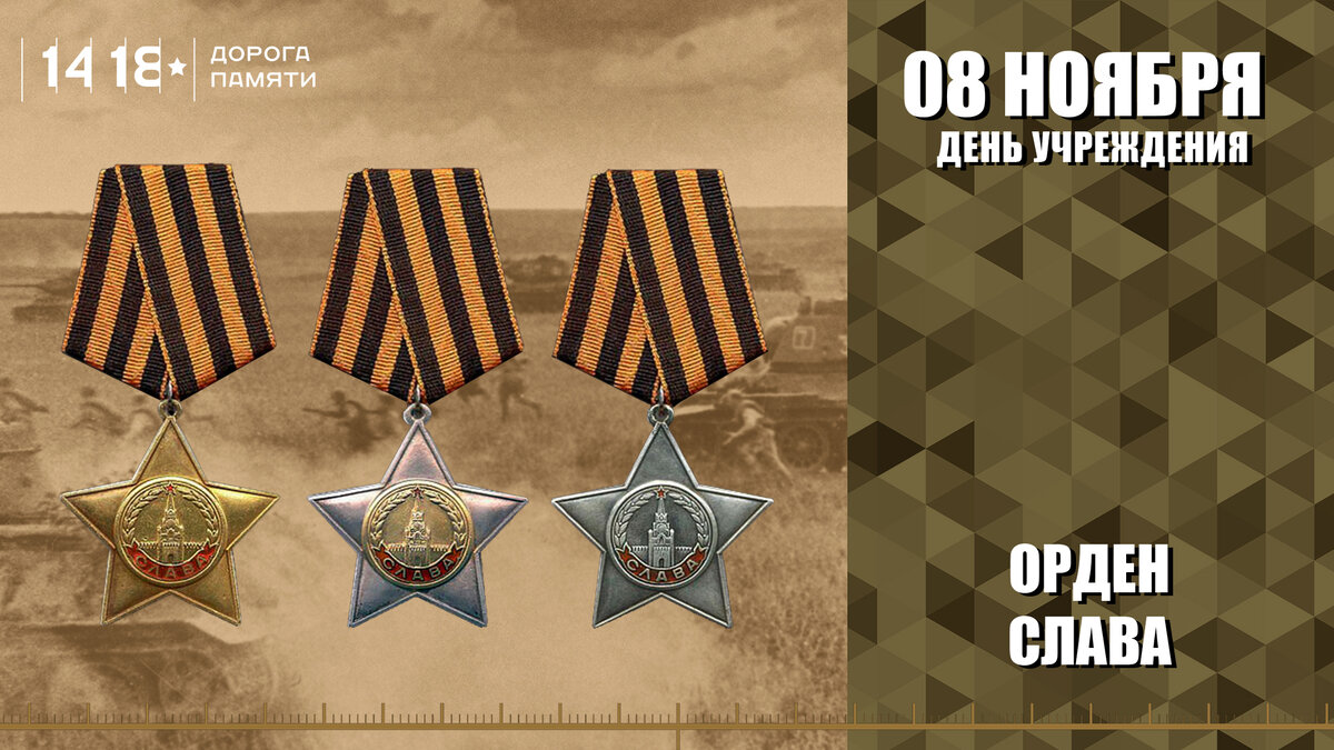 Орден Славы учреждён 8 ноября 1943 года одновременно с орденом «Победа». Он создан по личной инициативе Сталина и являлся «солдатским орденом» среди всех боевых наград. Он имел три степени, награждались им военнослужащие Красной Армии сержантского и рядового состава в восходящем порядке, от младшей степени (III) к высшей (I).