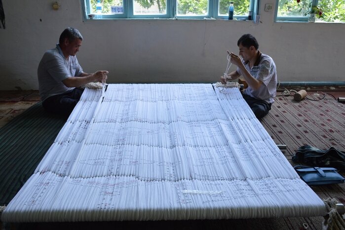 Или откуда столько восторга. Вообразите, что рисунок на ткани появляется не после изготовления основы, не связан отдельными петлями разных оттенков, а будет нанесен на длинные нити, которые последовательно окрасят согласно схеме художника, потом сложат в ткацкий станок и соберут в полотно. Мы, наблюдая за этой технологией не раз ловили себя на мысли, что мастера, которые работают над созданием тканей Бахмаль - люди с особыми невероятными талантами, волшебники… Ведь нам простым смертным очень сложно не запутать даже нить в обычной иголке, мотки при вязании мы стремимся превратить в клубки, леску на удочке - страшно даже пытаться распутывать - режем… А тут люди сотнями метров перемещают шелковые тончайшие нити, окрашивают их, перематывая в разных сегментах. И все у них получается, легко и непринужденно. Со стороны. На первом этапе нити натягивают, на вертикальный станок, их обматываю вокруг большой основы, ряд за рядом, размер этой основы, количество оборотов, плотность и сложность рисун