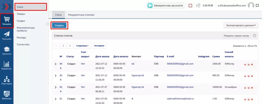 Возможность продавать курсы в рассрочку позволяет Вам расширить аудиторию, показать свою лояльность, а также проявить индивидуальный подход, что позитивно скажется на Вашей репутации. Есть несколько вариантов продавать курсы в рассрочку на базе Автовебофис. Вариант 1 Представим, что клиент не может прямо сейчас оплатить полную стоимость желаемого курса, но готов внести предоплату. Например, курс состоящий из 10 уроков стоит 10 000 руб., а у клиента прямо сейчас есть всего 3 000 руб. Ваши менеджеры могут выставить ему счет на 3 000 руб. и прямо сейчас открыть доступ к курсу.Чтобы выставить счет клиенту нужно: 2. В открывшемся окне укажите e-mail покупателя и другую необходимую информацию, нажмите “Сохранить”: 3. В открывшемся окне укажите товар и цену. Цена будет являться первоначальным взносом. Нажмите “Сохранить”: 4. После сохранения Вы попадете на страницу редактирования счёта. Нажмите “Отправить счёт”. Вашему клиенту на указанную почту придет ссылка на оплату товара: 5. После оплаты