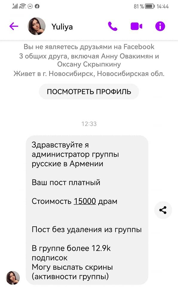 С интересом наблюдаю, как бежавшие в Армению россияне обустраиваются и делют это за счёт своих же наивных соотечественников. Порой через банальный обман. Мой друг Рубен Пашинян - человек общительный и интересующийся и решил записаться в фейсбучную группу "Русские в Армении", чтобы быть полезным приехавшим россиянам, подсказать что посмотреть, как решить проблемы, дать совет. Но выяснилось, что для размещения в группе сообщений надо платить и конкретно платить - 15 000 драм (40 долларов), что владелица группы из Новосибирска обьясняет тем, что у нее целых 12 тысяч подписчиков. По этой логике, я со своими суммарно 80 тысячами подписчиков должен брать в восемь раза больше за комментарии? Шучу. Рубика такая наглость гостей Еревана озадачила и огорчила. Он человек открытый, добрый, местами даже наивный в своей искренности. И денег лишних у его нет, покольку живет на скромную ереванскую зарплату. И вдруг до него дошло, что на его доброте тупо хотят срубить бабла. Группа, созданная якобы дл