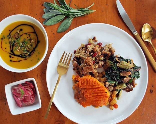 Это блюдо с верхним слоем из сладкого картофеля станет прекрасным украшением для любого праздника. Начинка из нута и овощей придает пирогу приятный вкус и аромат. Ингредиенты ( на 8 порций ) 250гр нута, сушеного или консервированного 2 лавровых листа 450-500гр репы 250гр шампиньонов 2-3 средние моркови 1 большой или 2 средних лука-порей 2 больших стебля сельдерея 2 средних зубчика чеснока 3-4 веточки шалфея 2 веточки розмарина 4-6 веточки тимьяна 2 чайные ложки молотого черного перца 2 чайные ложки томатной пасты 1/4 стакана цельнозерновой муки 2-4 чашки овощного бульона 2-2.5 кг сладкого картофеля ( батат) 4 яичных желтка 4 столовые ложки оливкового масла соль по вкусу Поехали! Замочите нут на ночь в слегка подсоленной воде, чтобы она покрывала его. Если у вас нет времени, положите нут в кастрюлю, залейте слегка подсоленной водой, доведите до кипения, затем выключите огонь и оставьте на 2 часа. Все вымойте и нарежьте на кусочки одинакового размера. Разогрейте духовку до 220 гра