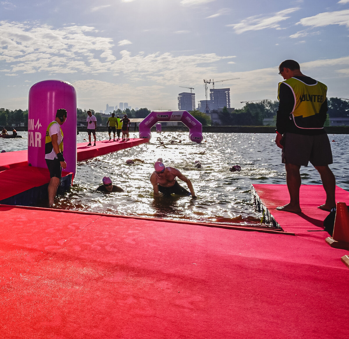 Триатлон Triathlon — это циклический вид спорта, который состоит из трех этапов и транзитных зон между этапами: То есть соревнования по триатлону проходят следующим образом: спортсмен выходит на старт Плывет (750 м., 1.5 км., 1.9 км., 3.8 км.,) в зависимости от дистанции гонки, после того как спортсмен закончил плавательный этап он забегает в транзитную зону номер один где переодевается на велоэтап, после транзитки он начинает велогонку (20 км., 40 км., 90 км., 180 км. ) после прохождения велоэтапа триатлет заходит в транзитную зону номер два где переодевается на беговой этап и начинает бег (5 км., 10 км., 21 км., 42 км.), после окончания бега финиш всей гонки. Между первым этапом (плавание) и вторым этапом (велосипедная гонка) спортсмен посещает транзитную зону номер один (транзитка, первая транзитка, транзитная зона) в которой триатлет снимает гидрокостюм, шапочку для плавания, очки для плавания, надевает велотуфли (велоботинки), надевает шлем (велосипедный шлем), берёт свой велосип