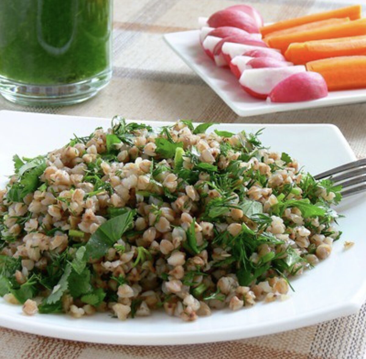 СПОСОБ ПРИГОТОВЛЕНИЕ👇🏻 Гречневая крупа - 1 стакан Рубленая петрушка - по вкусу Рубленая кенза(кориандр) - по вкусу Лимон - 1/2 штуки Оливковое масло - 2 столовые ложки Соевый соус - по вкусу Инструкция приготовления 1. Гречку промыть, залить 2 стаканами кипятка, посолить, накрыть крышкой и укрыть полотенцем. Через 45–60 минут, гречку можно будет есть, она не потеряет никакой пищевой ценности. Это лучше сделать на ночь. 2. Необходимое количество запаренной гречки в порционной тарелке заправить оливковым масло, соевым соусом, лимонным соком или порубленным лимоном и нашинкованной зеленью, перемешать. 3. Подавать с нарезанными овощами, такими как болгарский перец, морковь, тыква, редис и зеленым коктейлем.