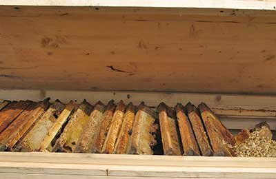 При плохих медосборах хранил соты на дворе, и они всегда были в хорошем состоянии, несмотря на то что на некоторых находились остатки коконов. А в последнее время при хранении сотовых рамок не применяю даже предохранительных решеток против мышей, надеясь на своих кошек. Однако плохо, если осы или пчелы успевают залезть в вышеописанную колонну через щели между надставками (осы тоньше пчел, поэтому они первыми успевают напасть на остатки корма).