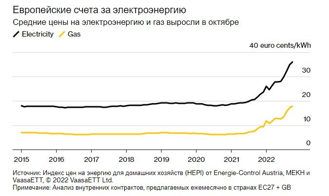 Всё закономерно так-то. Цены на углеводородное сырьё начали ещё активней, как пришёл время, "выливаться" на потребительский рынок. Как сообщает Bloomberg, европейские домохозяйства платят больше, чем когда-либо, за электроэнергию и природный газ, даже несмотря на то, что правительства тратят миллиарды долларов на "защиту" потребителей от энергетического кризиса. По данным энергетического консалтингового агентства VaasaETT Ltd., средняя розничная цена на газ в Европейском союзе и в Великобритании составляла в октябре почти 18 евроцентов (0,18 доллара США) за киловатт-час, что вдвое больше, чем в том же месяце прошлого года. Расходы домохозяйств на электроэнергию выросли на 67% до 36 евроцентов за киловатт-час. Цифры появились после того, как правительства ЕС пообещали выделить более 550 миллиардов евро на "защиту" граждан и предприятий от резкого роста цен на энергию. По словам Филипа Льюиса, главного исполнительного директора хельсинкской консалтинговой компании, если бы государства не