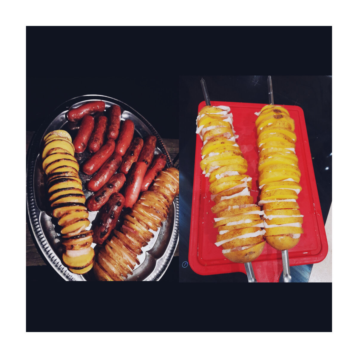 Выходные были очень вкусные!Делюсь с вами рецептом своей любимой картошки.Улетает со стола первой. Ингредиенты; Картофель 1 кг Сало 300гр Чеснок 4 зубчика Оливковое масло 2 ст.л Перец чёрный Специи по вкусу Фольга. Готовим: Так как запекать картофель мы будем в кожуре ,то его нужно тщательно помыть с помощью губки далее нарезаем картофель на ровные кружочки. Сало можно использовать любое,нарезать его нужно на равные пластины. Чеснок пропустить через пресс и смешать с двумя столовыми ложками масла,добавить соль,перец и прованские травы по вкусу.Тщательно перемешать. Чередуя сало и картофель насаживаем на шампур, смызываем маринадом и заворачиваем в фольгу(фольгу не жалеем в 2-3слоя). И отправляем на угли запекаем минут 20 периодически переворачиваем ,картофель готов снимаем фольгу и держим ещё 5 минут.Приятного аппетита!Не забудь поставить лайк ❤