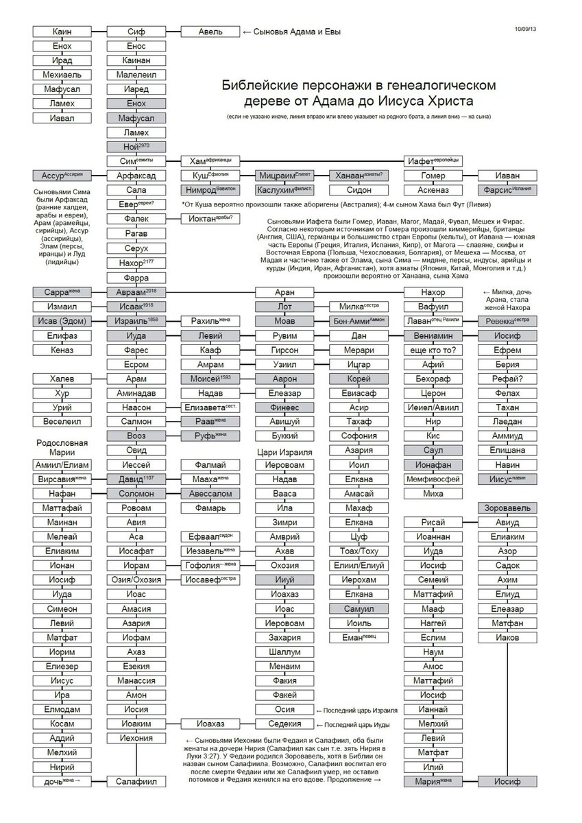 Допотопные патриархи Потомки Адама через Сифа перечисляются, не считая самих Адама и Сифа, на протяжении восьми поколений. О них рассказывается несколько подробнее, чем о потомках Каина. Это так называемые допотопные патриархи. Имена родословной Сифа подозрительно похожи на имена родословной Каина. В обеих есть Енох и Ламех, а также другие имена, если не одинаковые, то очень похожие. Возможно, обе эти родословные линии опираются на один и тот же легендарный материал, но одна линия почерпнута из кодекса J, а другая — из кодекса Р. Допотопные патриархи славятся своим долголетием. Некоторые из них, в том числе и сам Адам, жили около тысячи лет. Рекордсменом является Мафусаил, чье имя стало нарицательным: он дожил до 969 лет. Эти патриархи не могут отождествляться с какими-либо историческими персонажами, и, помимо простого упоминания в Библии, о них ничего не известно. Однако похоже, что это перечисление восходит к шумерским преданиям, в которых рассказывается о девяти или десяти царях, пр