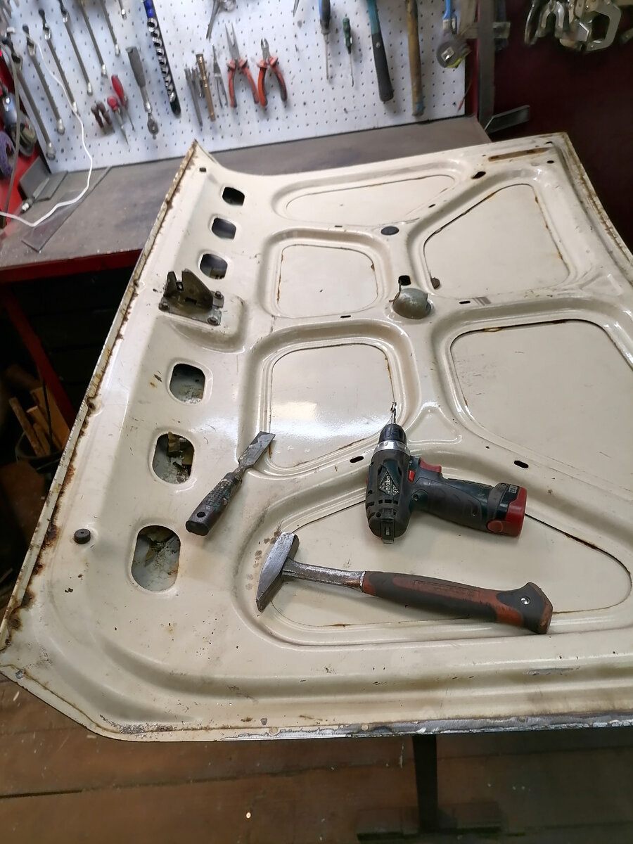 ... Продолжение. Крышка багажника моей машины совершенно отвратительная. Коррозия погрызла качественно. По-хорошему надо менять, но ничего более-менее вразумительного поблизости не оказалось. Что ж, попробуем восстановить. Сразу предупреждаю - во-первых, это не профессиональный ремонт, во-вторых - делаю для себя, а не для музея, никаких гарантий что дефекты не вылезут обратно через неделю/месяц/год. На то она и крышка багажника, в случае чего размахнуться и выбросить никогда не поздно. Крышка состоит из двух деталей - основания-усилителя и наружной панели - рубашки, филенки, как ни назови - лучше не становится. Наружная панель по периметру загнута "конвертиком" вокруг усилителя, через 10-15 см прихвачена точечной сваркой. Для начала отсверливаю точки сварки, потом отгибаю кромку с помощью молотка и стамески. Все больше склоняюсь к тому, чтобы не заниматься ерундой.. Тем не менее, детали успешно разъединены, без серьезных повреждений. Осмотрим внутренние поверхности. Усилитель имеет