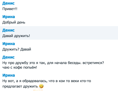 Я уже как-то объясняла, что предпочитаю встречаться на улице - в парке или на набережной. Никаких кафешек с незнакомцами. А кофе и в парке можно купить. Зато в любой момент можно слинять и никто никому ничего не должен. Это к диалогу выше ☝🏻