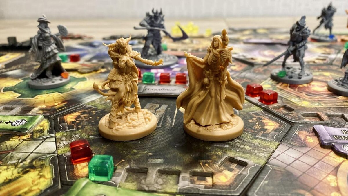 Выглядит игра потрясающе, причем это касается всех компонентов. Тайлы комнат — крупные, яркие и с отличным дизайном, напоминают декорации из «Особняков безумия». Карты заклинаний — со стильной черной рубашкой и отличными шрифтами. Карточки событий и заданий — будто древние свитки со старинными изображениями. А миниатюры — большие и детализированные: пожалуй, лучшие, что я видел в настольных играх. Я не умею их красить, но после распаковки всерьез задумался о том, чтобы закупиться всем необходимым и наконец разобраться в этом популярном хобби.