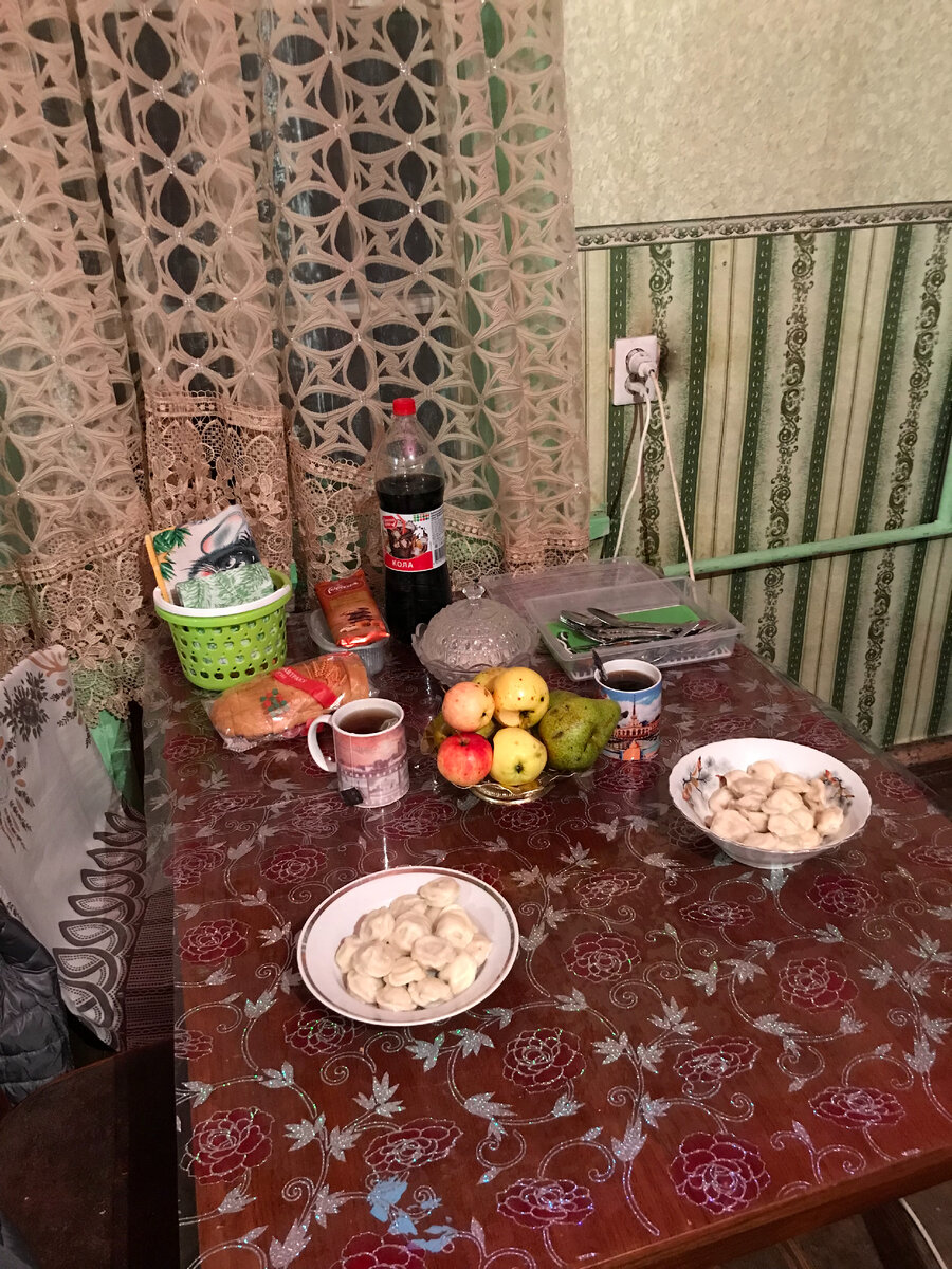 В середине лет мы с мужем стали владельцами домика в сельской местности. Про то, каким он нам достался - вот здесь (позитив) и ещё здесь (страшилки). И, как всегда бывает в подобных случаях, вместе с домом нам досталось то, что прежним хозяевам оказалось уже не нужно. А нам? В первый момент мне хотелось от всего этого "наследства" скорее избавиться. Ну, почти от всего. Помешали две вещи. Первое - возможности. Не те нас доходы, чтобы вот так с маху нанять грузовик с бригадой грузчиков и отвезти всё это... кстати, куда отвезти? Вывоз мусора в деревне - больная тема. По крайней мере, в нашей. Но это отдельный разговор, сейчас - о второй причине. Вторая причина очень смахивает на первую: на зарплату бюджетника не сильно разгонишься с покупкой новой мебели. Есть среди вас те, кто не верит? Вот то-то же! Покушать же, хоть и нет у меня там времени на разносолы, всё равно хочется за столом. И сидя попой на стуле. Примерно так выглядит обед в нашем новомстаром доме (яблочки, кстати, несмотря