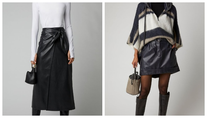 Кожаные вещи тренд холодного сезона. Куда ни глянь, повсюду кожаные платья, стильные юбки, шорты, штаны. В данной статье стилисты покажут нам на конкретных примерах, как и с чем лучше всего сочетать кожаные юбки в холодное время года. Юбка «колокольчик из цветной кожи, с завышенной талией, в данном образе гармонично смотрится с водолазкой с золотым люрексом, клетчатым пальто, а также высокими кожаными сапогами винного цвета и на каблуке. Еще один вариант стильного образа с макси юбкой из бордовой кожи стилисты составили с помощью белоснежных кроссовок, футболки и оверсайз жакета в оттенке марсала. Черная кожаная юбка прямого кроя миди длины отлично смотрится с белоснежной блузкой, а также высокими сапогами в ковбойском стиле. Трендовый total black look включает в себя миди юбку-карандаш, водолазку с высокой горловиной, замшевые ботфорты, массивное колье, а также кожаный клатч на длинном ремешке с контрастной фурнитурой. Перед вами женственный и элегантный аутфит, который идеально подо