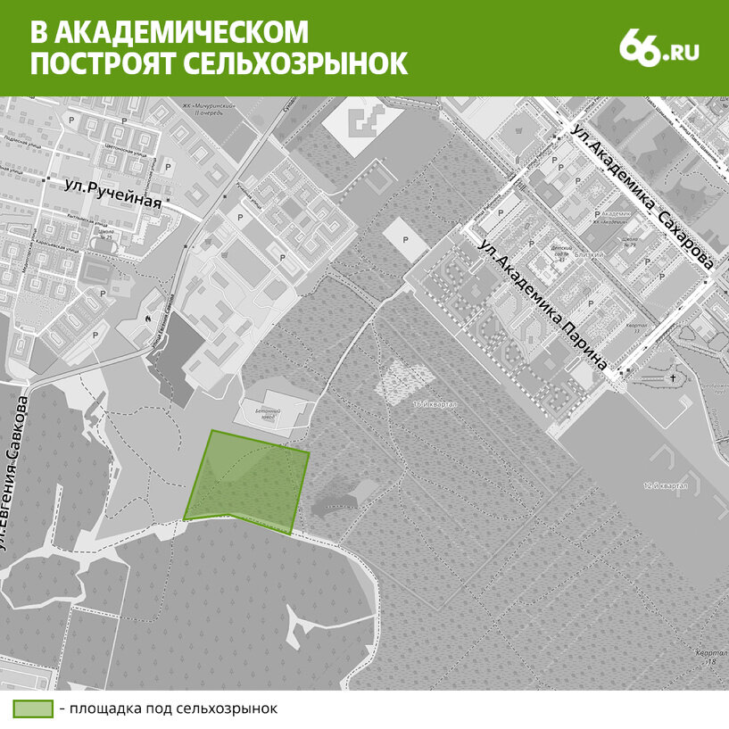По словам владельца ООО «Агромир» Олега Хабибуллина, на проектирование уйдет ориентировочно полтора года. А строители могут приступить к работе уже в конце 2023 года. «Ядро проекта — сельхозрынок. Это то, что было обещано компании «Кортрос» (застройщик Академического), администрации города и жителям. Что конкретно еще заложено в проекте, пока сказать не могу», — уточнил предприниматель корреспонденту 66.RU. Необходимое согласование от администрации Екатеринбурга Олег Хабибуллин рассчитывает получить до конца этого года. Рынок должен появиться в 32-м квартале второй очереди строительства Академического района. Это прямоугольный участок вдоль перспективной улицы Верхнеуфалейской, где строительство жилых кварталов еще не началось. При планировании района территорию отводили под производство, но ситуация изменилась — землю у структур группы компаний «Кортрос» выкупил «Агромир». По планам на участке площадью 7,6 га (это сопоставимо, например, с Кировским оптовым рынком, но меньше «Таганског