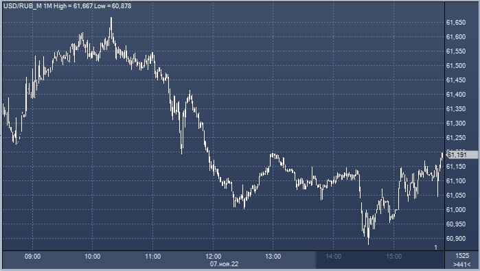 В ноябре вероятна торговля в диапазоне, но в более широком, нежели было последние 2 недели. Курс доллар/рубля на Мосбирже интервалами в 1 минуту Курс доллар/рубля на Forex интервалами в 4 часа Рубль укреплялся против доллара в понедельник, 7 ноября. По мнению Михаила Шульгина, начальника отдела глобальных исследований «Открытие Инвестиции», российская валюта отыгрывала события пятницы, учитывала слабость доллара на международном рынке, а также рост цен на нефть Brent до максимальных значений с 31 августа. Меж тем цены на нефть Brent отскочили от уровня 98 долларов за баррель и курс доллара к рублю отскочил выше поддержки 61,00. Аналитики Sber CIB предсказывали тестирование на прочность этого уровня. По их мнению, цена нефти марки Brent может опуститься до $96,5 за баррель. А на рынке гособлигаций на первый план выйдут опасения, что на аукционах в среду ОФЗ снова будут размещены со значительным дисконтом. В связи с этим доходности гособлигаций могут вырасти на несколько базисных пунктов
