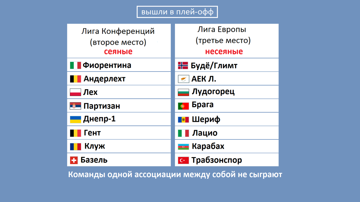 Состоялась жеребьёвка 1/16 финала. Как известно, все участники были разделены на две большие корзины по 8 команд в каждой. В первую вошли обладатели вторых мест групп Лиги Конференций: Их возможными соперниками стали прибывшие из Лиги Европы обладатели третьих мест: Команды из первой корзины сыграют против второй. Жеребьёвка сформировала следующие 8 пар: Игры 1/16 финала – 16 и 23 февраля. Лучшие команды этого раунда выходят в следующий этап, где сразятся с победителями групп Лиги Конференций. Истанбулом, Вест Хэмом, Вильярреалом, Ниццей, АЗ, Юргорденом, Сивасспором, Слованом. С вами был «Алекс спортивный». Благодарю за просмотр.