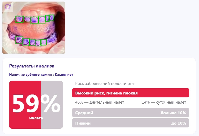 По результатам отчета DIANA мы можем сделать вывод, что у пациента неудовлетворительная гигиена полости рта. Риск развития заболеваний высокий. 46% поверхности зубов покрывает длительный налет, 14% - суточный.