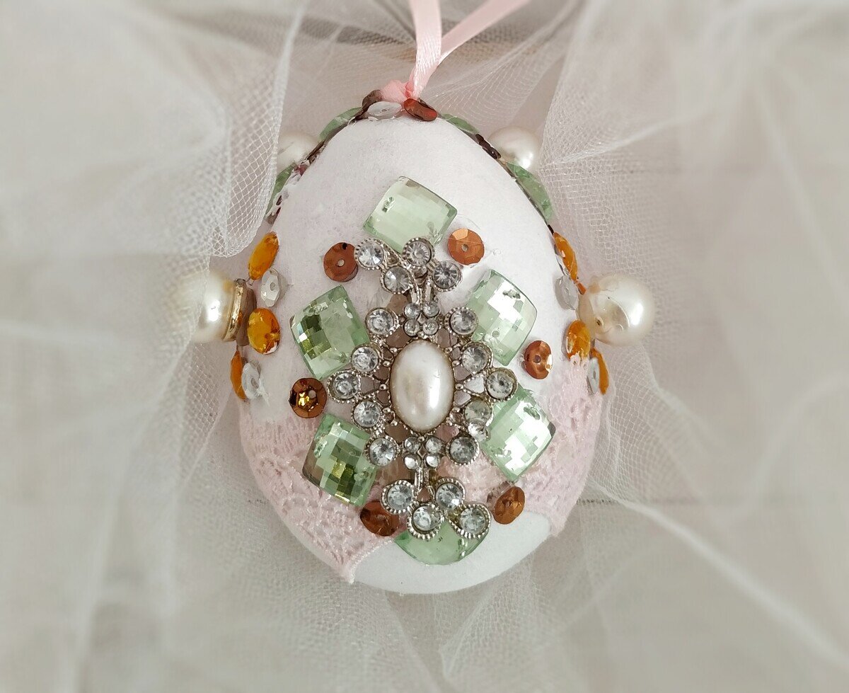 Всем привет!!! С Вами снова Таня Исаева!!! Сегодня мы с Вами попробуем сотворить необычное новогоднее украшение в стиле яиц Фаберже. Сразу оговорюсь, что у нас нет задачи создать ювелирное украшение, скорее это про то, как можно дать вторую жизнь привычным и ненужным вещам. МАТЕРИАЛЫ И ИНСТРУМЕНТЫ. Материалы и инструменты Для того, чтобы сделать такую игрушку нам потребуется: - большое пластиковое яйцо от киндер сюрприза - клей "Момент Кристалл" - горячий клей- пистолет - акриловая краска (того цвета, которым Вы будете закрашивать своё яйцо (у меня белая) - небольшая губка для мытья посуды (чтобы наносить краску) - тонкая синтетическая кисть - бижутерия (хотя бы один крупный элемент, чтобы вокруг него выстраивать декор - кружево - стразы, пайетки, пуговицы и другой декор. - тонкая лента, чтобы сделать петельку, за которую мы будем вешать наше яйцо - мягкий карандаш для разметки декора. Для начала рассмотрим, какие материалы могут нам с Вами пригодиться: Помните о том, что я Вам показ