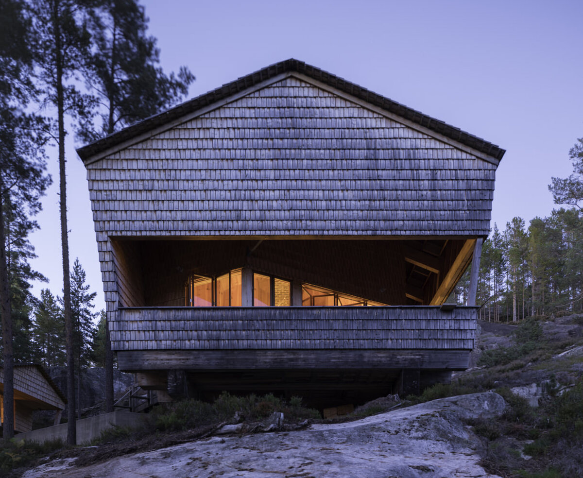 Для тех, кто устал и польше не может, предлагаем погрузиться в невероятную атмосферу нордической природы и архитектуры. Полагаем, что даже подписи к фото излишни. Просто красивое. На постройку этого уединённого дома, из просторной залитой солнцем гостиной которого открывается вид на озеро, архитекторов вдохновил труд писателя-натуралиста «Уолден, или Жизнь в лесу» Генри Торо. Облик постройки также перекликается с домами местных фермеров. Главное помещение в доме – гостиная с высокими потолками и внушительных размеров камином. За ним расположены спальни и кладовые. Снаружи крыша и стены облицованы сосновым гонтом внахлёст. Такая отделка, хоть и создаёт дополнительные трудности при укладке (толщина у дощечек разная), но хорошо защищает стены от влаги. Это, а также наклонные стены предотвращает попадание осадков и на открытую террасу в течение всего года. Поблизости расположена отдельно стоящая сауна похожей конструкции. И дом, и сауна приподняты над землёй, что также позволяет постройкам