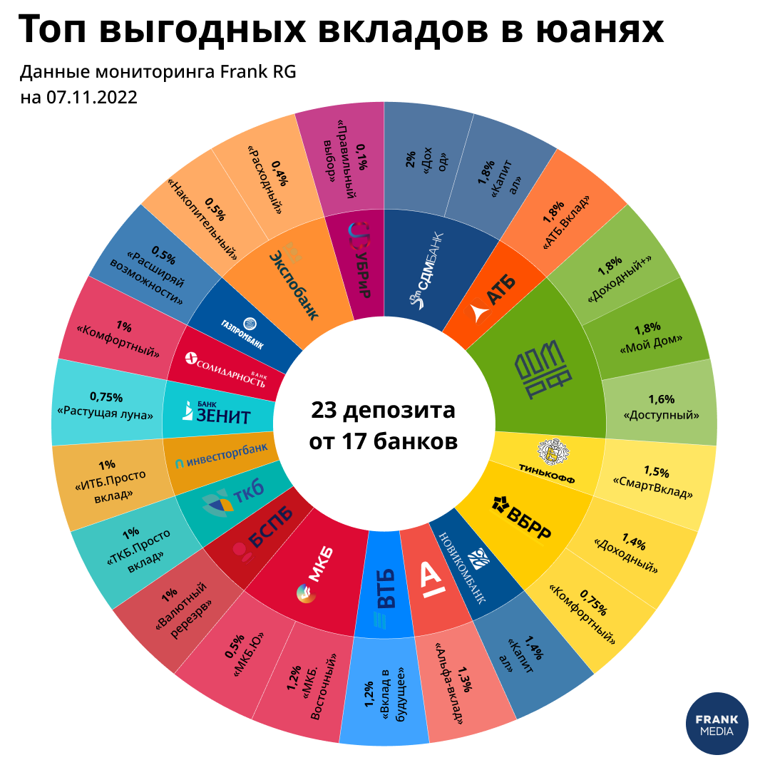 Мониторинг Frank RG составил рейтинг депозитов в юанях среди 50 банков. Мы публикуем топ-17 продуктов с максимальными ставками по таким вкладам: