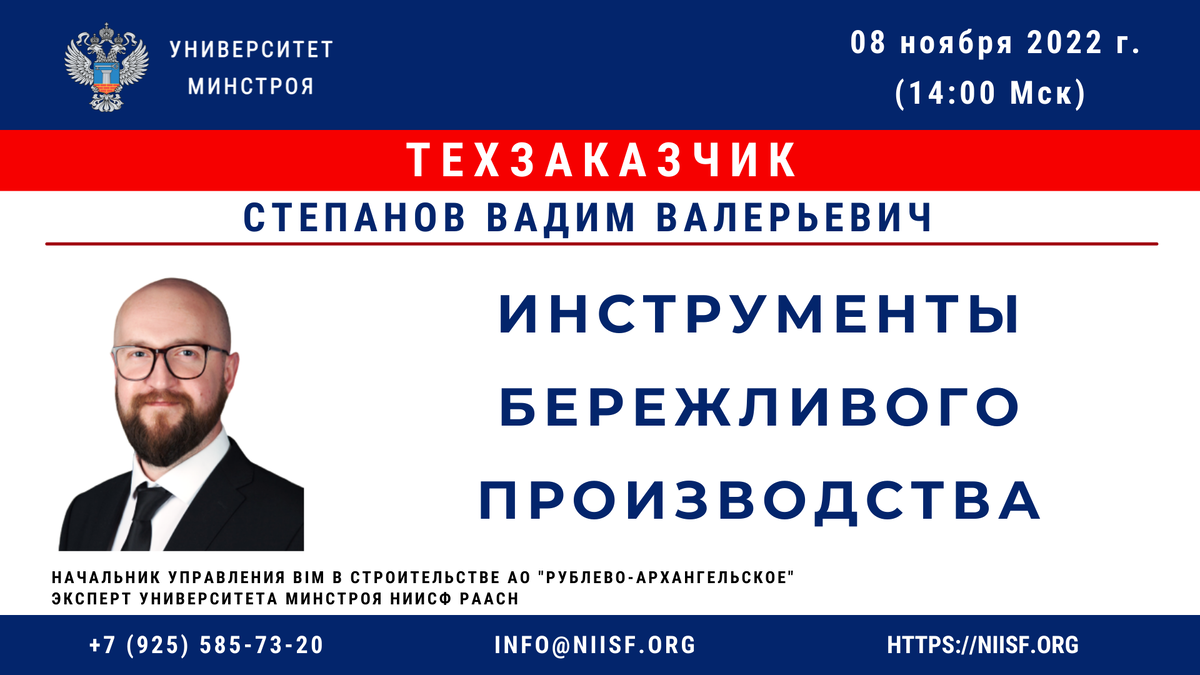Вебинар "Инструменты бережливого производства: цели и задачи стенда производственного контроля и анализа (ПКиА). 5С. Картирование. Хронометраж, решение проблем при управлении проектами в строительстве" Мероприятие проходит в рамках курса повышения квалификации «Управление службой технического заказчика при осуществлении государственных контрактов в условиях цифровой трансформации» 🎓Спикер: Степанов Вадим Валерьевич - Начальник управления BIM в строительстве АО "Рублево-Архангельское", Эксперт Университета Минстроя НИИСФ РААСН 📚В процессе вебинара будут рассмотрены следующие вопросы: Инструменты бережливого производства: 🔹Цели и задачи стенда производственного контроля и анализа 🔸5с 🔹Картирование 🔸Хронометраж, решение проблем при управлении проектами в строительстве 💫В настоящее время цифровая трансформация строительной индустрии находится в активной фазе благодаря усилиям и инициативам субъектов Российской Федерации, а также действиями Минстроя России и Минцифры России. Множест
