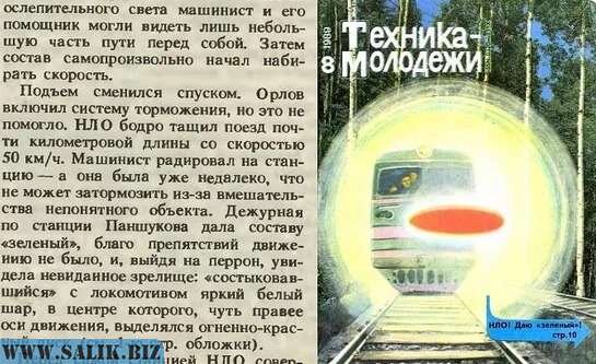 17 февраля 1989 год. случай на железной дороге. Смотрите журнал «Техника Молодёжи» № 8 за 1989 год. Или пройдитесь по ссылке прежде чем читать мою статью. Я не буду повторять, что уже написано. Фамилии очевидцев называть, станции перечислять. Поэтому прочитайте материал по ссылке, потом мою статью. https://salik.biz/articles/84367-odin-iz-samyh-izvestnyh-sluchaev-kontakta-s-nlo-v-sssr.html И так что там было на самом деле? Не буду упоминать названия местности, буду говорить, с чего всё началось. Видно, как очень длинный состав из крытых вагонов тянет дизельэлекровоз. К нему со стороны рощи, медленно нагоняя, к голове состава, подлетает плазмоид. Довольно больших размеров, для плазмоида, но не велик для летающей тарелки. Очень яркий шар, около семи метров в диаметре, это холодная плазма, оранжевого цвета, не однотонного желтоватыми оттенками. Это защитная оболочка. Внутри юлаобразное НЛО. примерно пять шесть метров в диаметре по кругу и три метра по высоте. НЛО заходит и становится впе