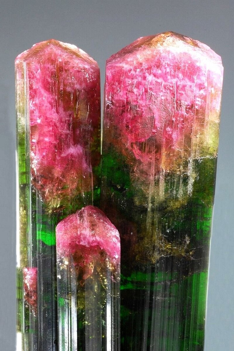 Поразительная особенность турмалина состоит в том, что его кристаллы редко бывают однородно окрашенными. Из-за колебаний химического состава один конец кристалла бывает зелёным, другой- красным. В разноцветном - полихромном турмалине полосы разного цвета, располагаясь поперёк призматического кристалла, могут сменять друг друга. Полихромные турмалины окрашены в два, три цвета или даже больше. Самая известная комбинация- арбузный турмалин, в котором кристалл в поперечном разрезе похож на кусок сочного арбуза: у него красная сердцевинка и зелёная « корочка».