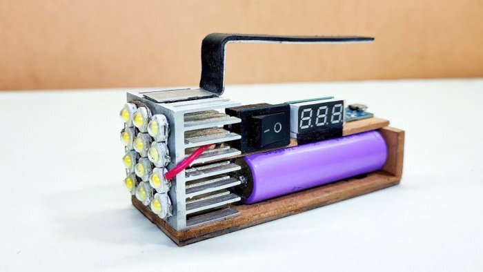 Как сделать 12-ваттный светодиодный мини-фонарик. Нет ничего невозможного. Да, конечно, можно такой фонарик купить. И он будет красивый, блестящий и недорогой. Но это не наш метод. Только сами, своими руками, из подручных материалов. Начали! В первую очередь необходимо подобрать яркие излучающие светодиоды. В фонарике их будет 12 штук. Значит мощность каждого не должна превышать 1 Вт. И они должны быть корпусными, т.е. не SMD. Изготовление яркого светодиодного фонаря своими руками Т.к. светодиоды при работе выделяют тепло, разместить их следует на теплоотводе. Для этого отлично подойдёт ребристый алюминиевый радиатор. Они приклеиваются к нему для фиксации. Ещё лучше, если при этом будет использоваться теплопроводящая паста. Светодиоды распаиваются по определенной схеме – плюсами к плюсам, минусами к минусам. Т.е. соединяются параллельно. Теперь время заняться питанием светодиодов. Напряжение источника питания должно быть не менее 3 Вольт. Для этого отлично подходит аккумулятор типа 186