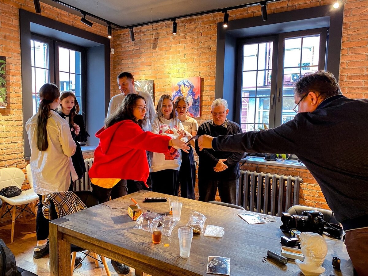 Так что напоследок Андрей Иванов ещё вдобавок сфотографировал учеников и преподавателей медиашколы клуба «Феникс» на плёночный фотоаппарат и пообещал потом изготовить нам на память настоящие ретрофотографии.