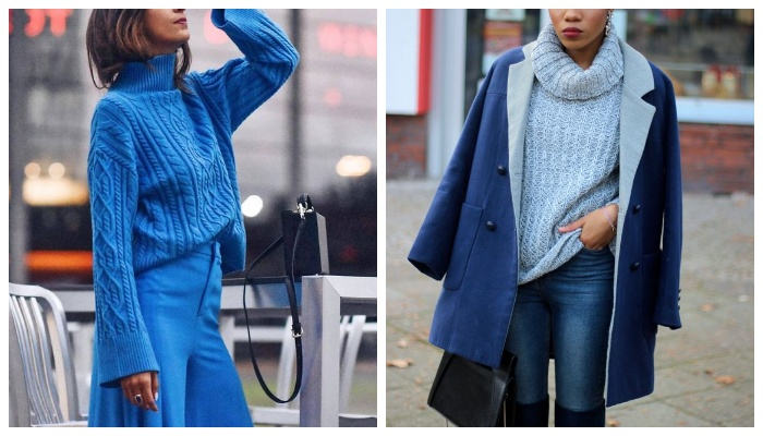 Внедряем синий цвет в свой гардероб красиво и уместно. Оставайтесь с нами, прямо сейчас гуру поды поделятся с нами некоторыми секретами, благодаря которым ваш осенне-зимний гардероб приобретет более выразительный вид. Свое знакомство с синим цветом можно начать с верхней одежды. В этом сезоне на первом плане яркая верхняя одежда: пальто, шубы Тедди, тренчи, куртки. Когда за окном температура приближается к отметке «0» нужно задуматься о чем-то теплом и при этом современном, например о пальто комплементарного синего оттенка. Перед вами подборка колоритных образов с эффектным синим акцентом в виде верхней одежды, ознакомившись с которой сразу же становится понятно, что синий гармонично перекликается с белым, черным, а также серым цветом в одежде. Платье-свитер насыщенного синего цвета с высокой горловиной + меховое пальто благородного карамельного оттенка + замшевые синие ботфорты + синий эффектный клатч на громоздкой цепи — идеальное сочетание повседневных вещей, которое создает праздн